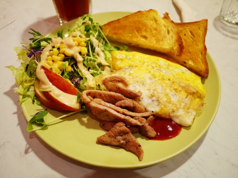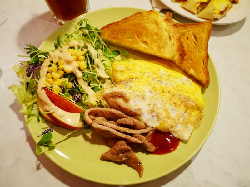 內容物是黑豬排、薯餅起司蛋、生菜沙拉與丹麥吐司,