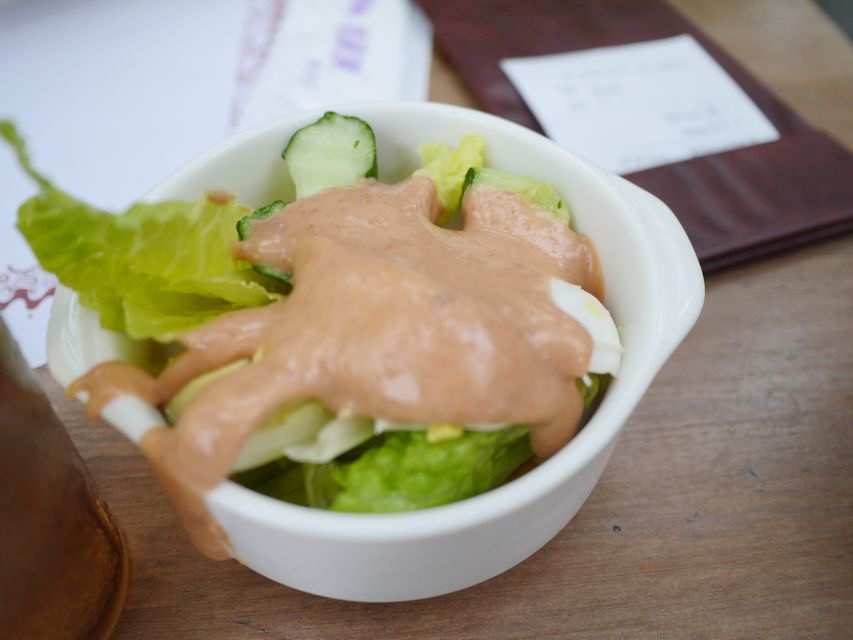 沙拉醬很好吃,好像是凱薩醬(有點忘了),還淋上一些油醋醬。