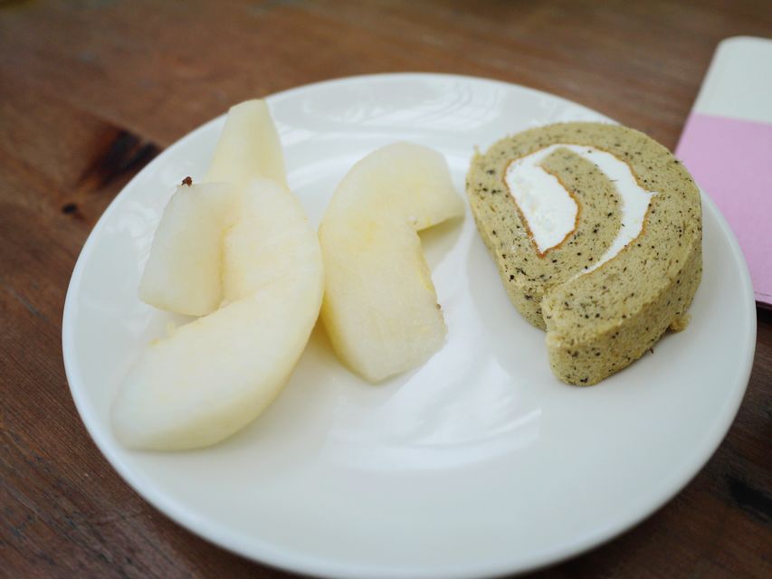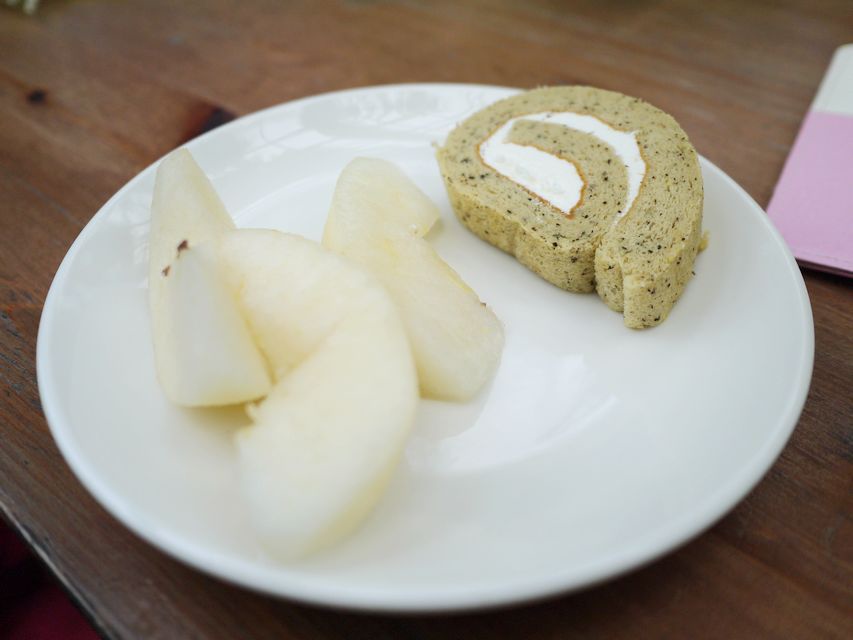 拿了水梨跟毛巾蛋糕捲。