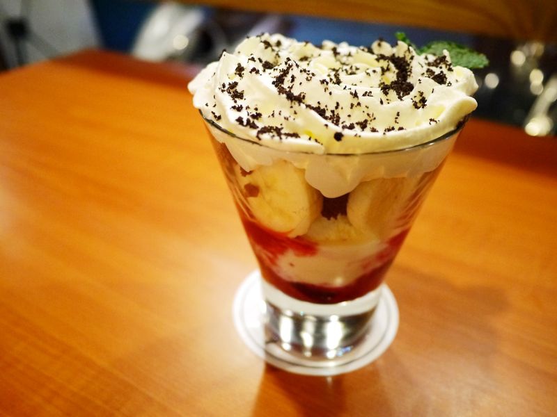 上面是鮮奶油,加上香草冰淇淋,口感層次豐富,搭上香蕉片很不錯。