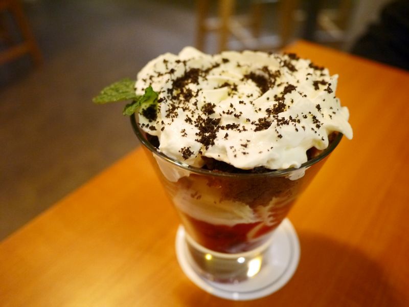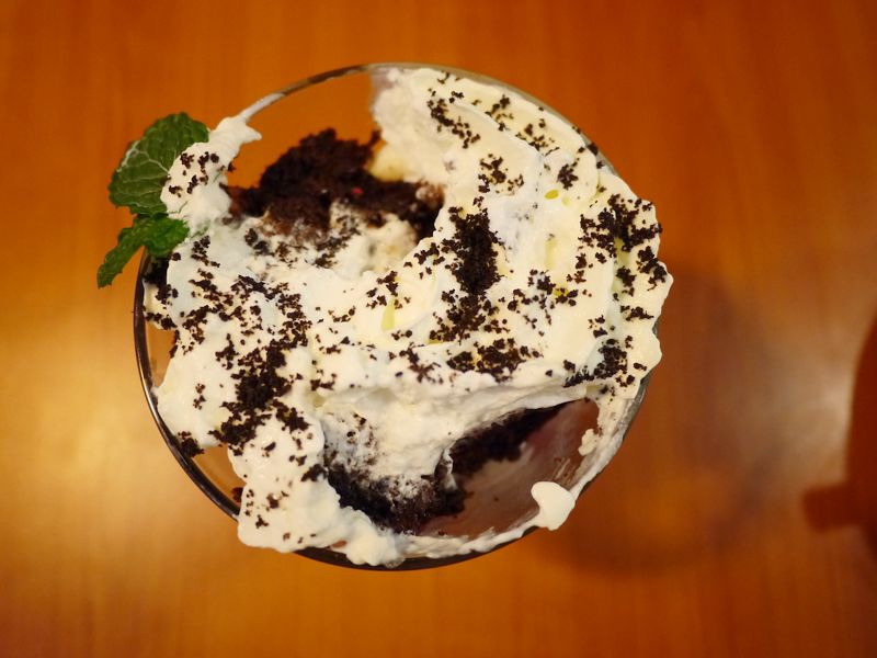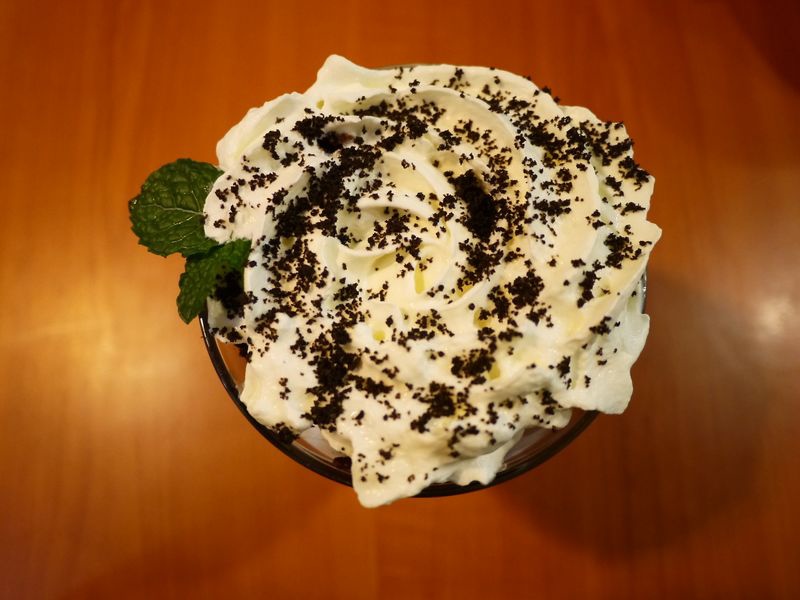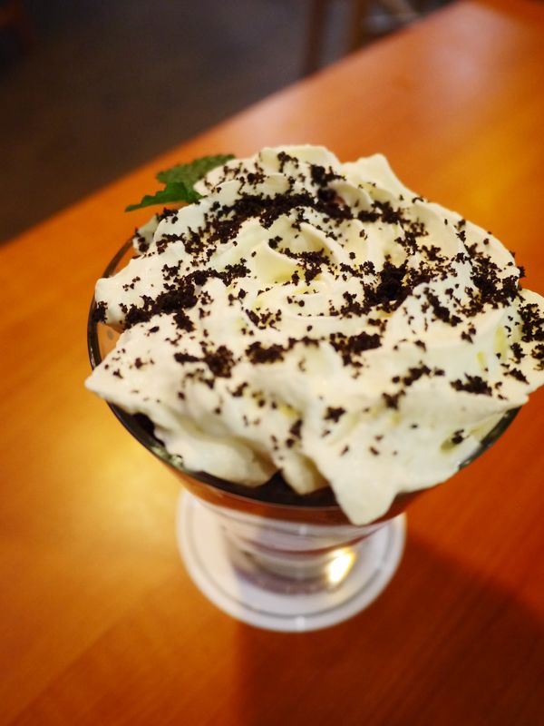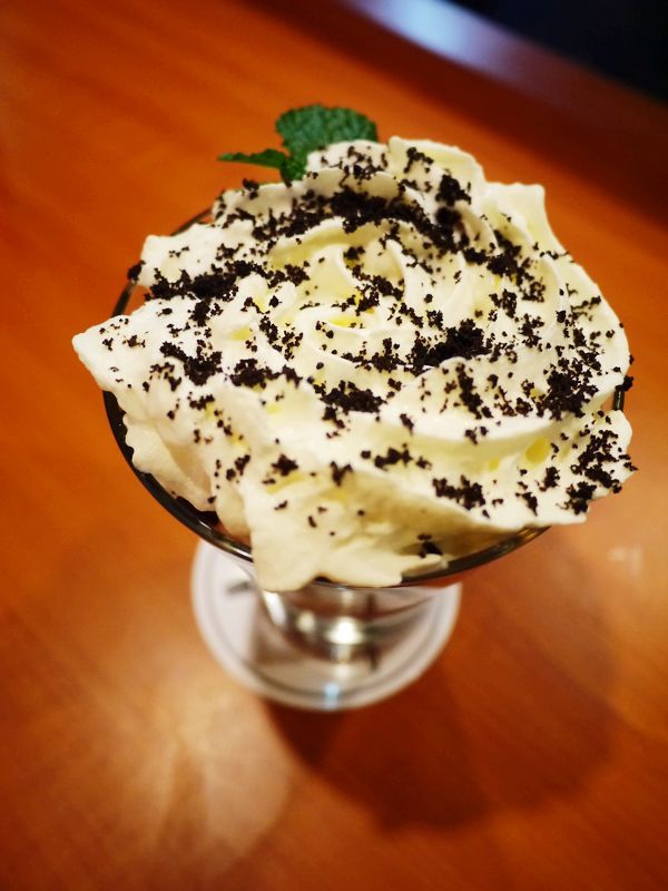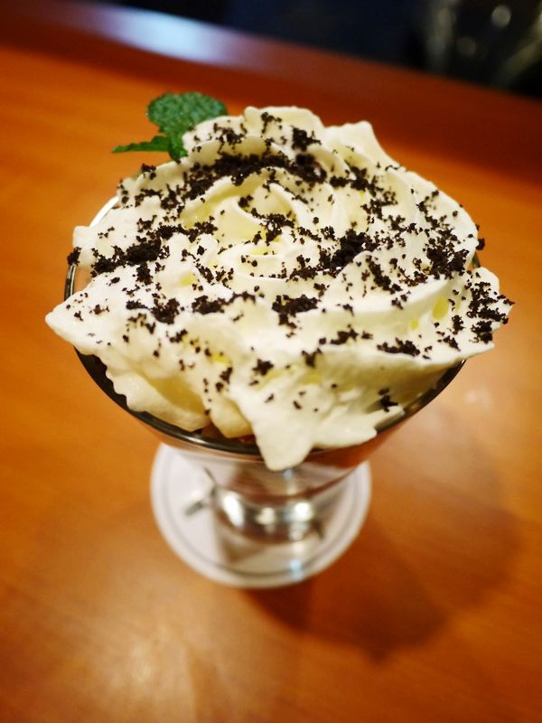 上面是一層滿滿的鮮奶油花,撒上巧克力碎粉,黑黑一點一點的讓我覺得很帥氣XD