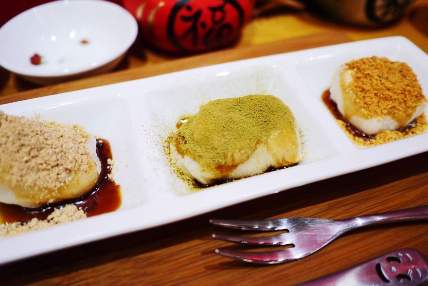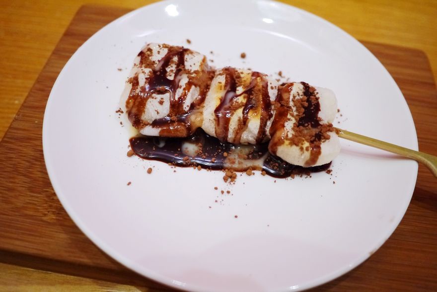 淋上煉乳會稍微甜一些,巧克力醬、煉乳都跟麻糬好配喔XDD