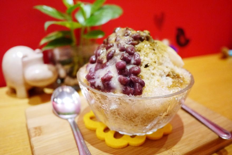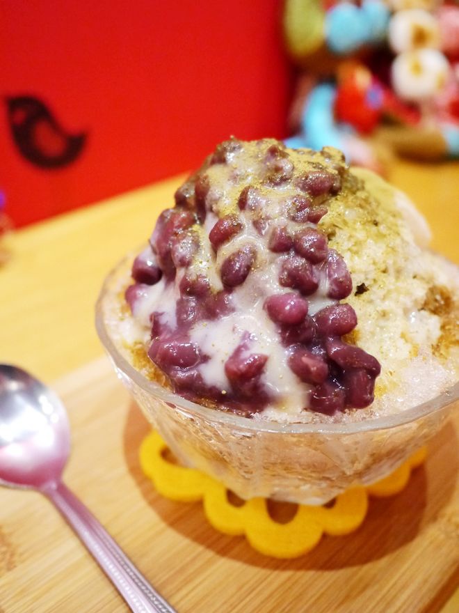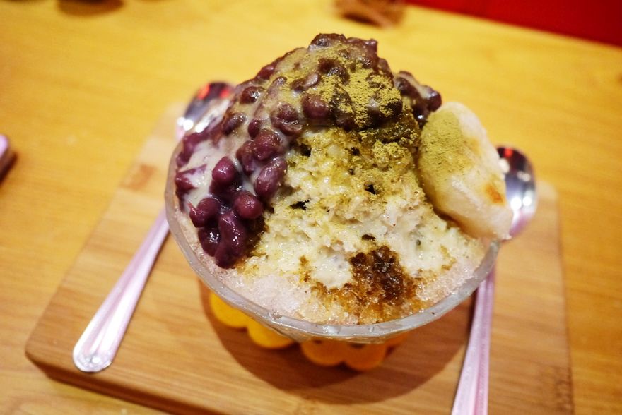 還有抹茶刨冰,灑上微苦的抹茶粉,鋪上大量香甜軟爛的紅豆,再淋上煉乳與黑糖,很好吃