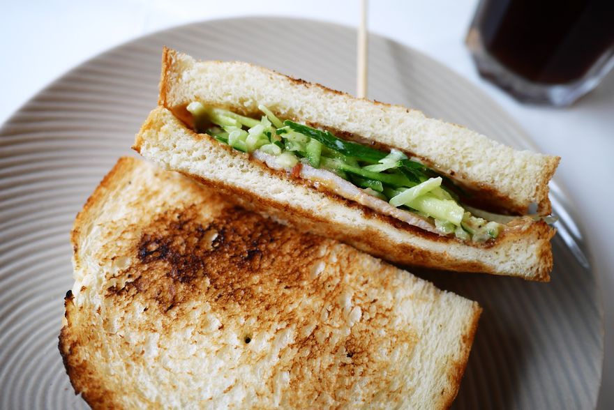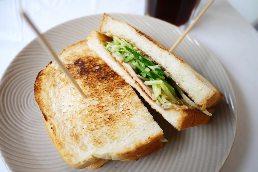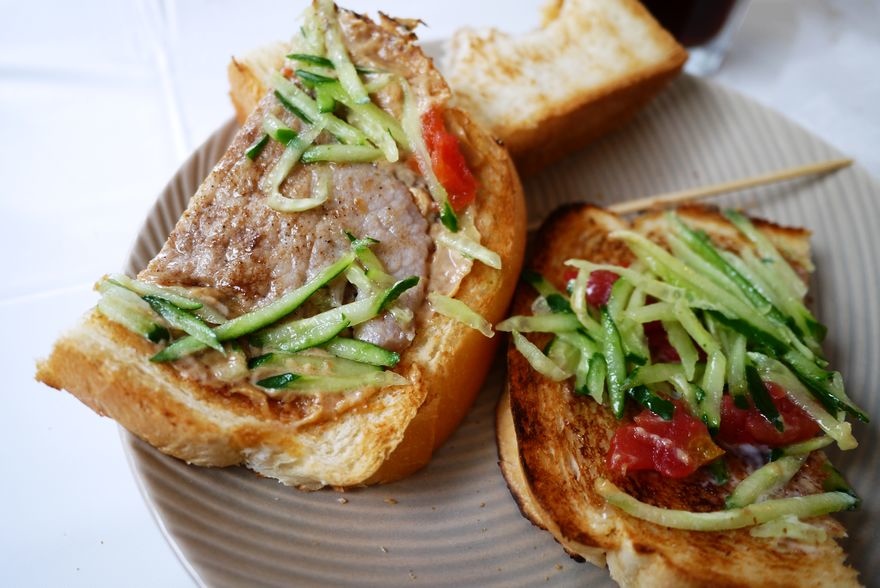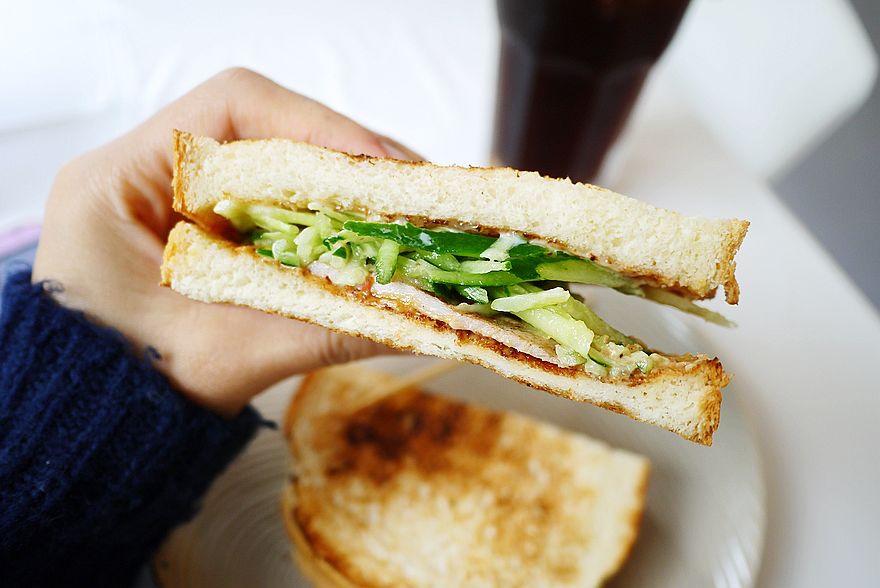 吐司烤得很酥脆,抹上薄薄一層花生醬、美乃滋與少量的小黃瓜絲、番茄,